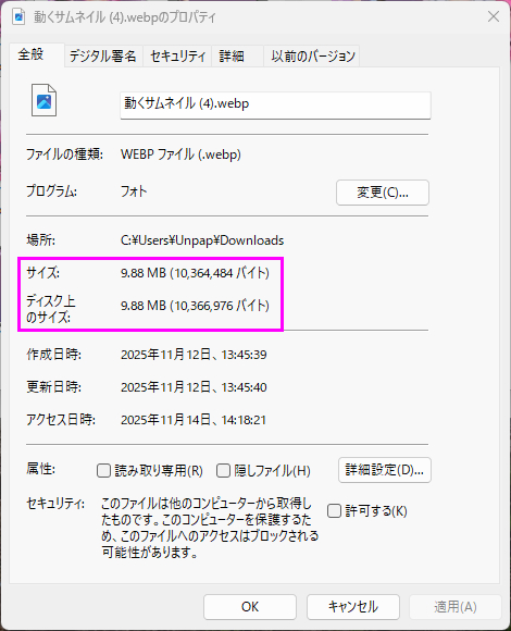 保存できたらデータの重さが「10mb以下」か「プロパティ」を開いて確認してみよう