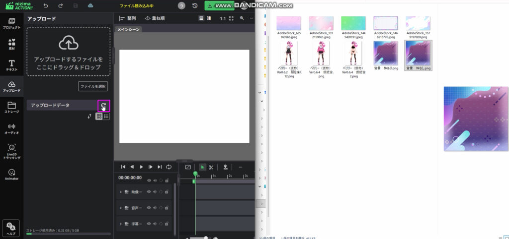 事前に作成/準備した「背景画像」をドラッグしてサイトに移動させると「アップロード画面」に移るので