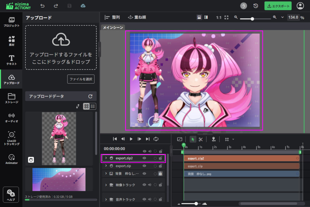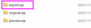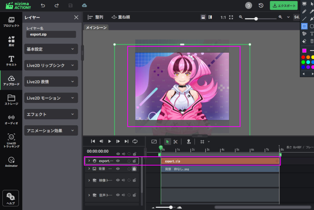 この「export.zip」データを「Nizima Action!!」にアプロードしよう