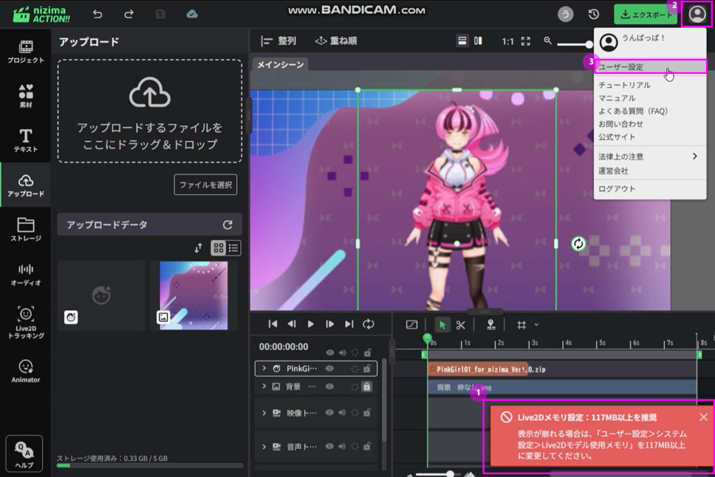 「ユーザー設定」⇒「システム設定」⇒「Live2Dモデルの使用メモリ」を