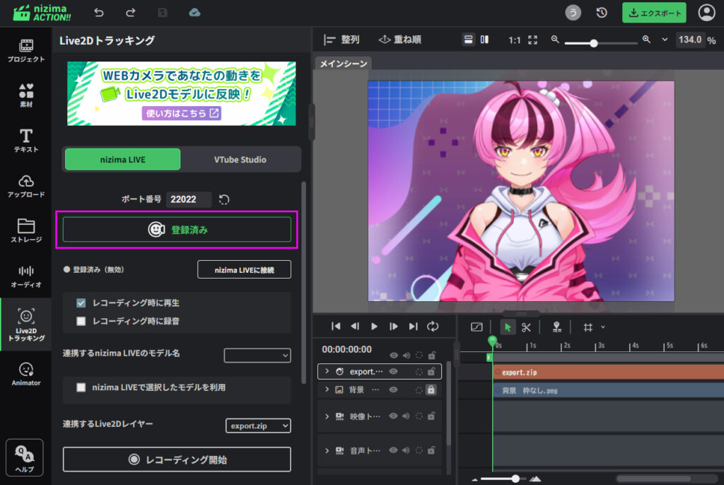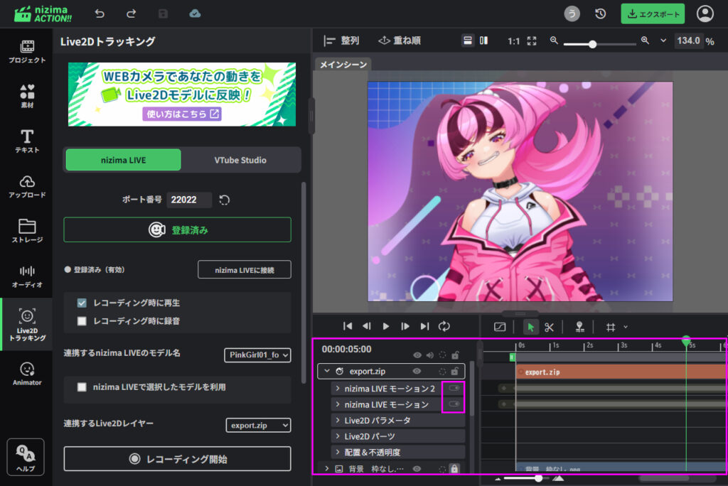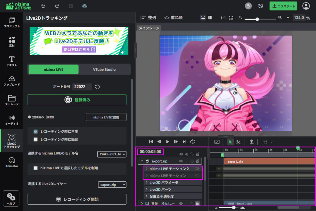 これにて【5:「Nizima Live」と連携して動かす】は完了だ