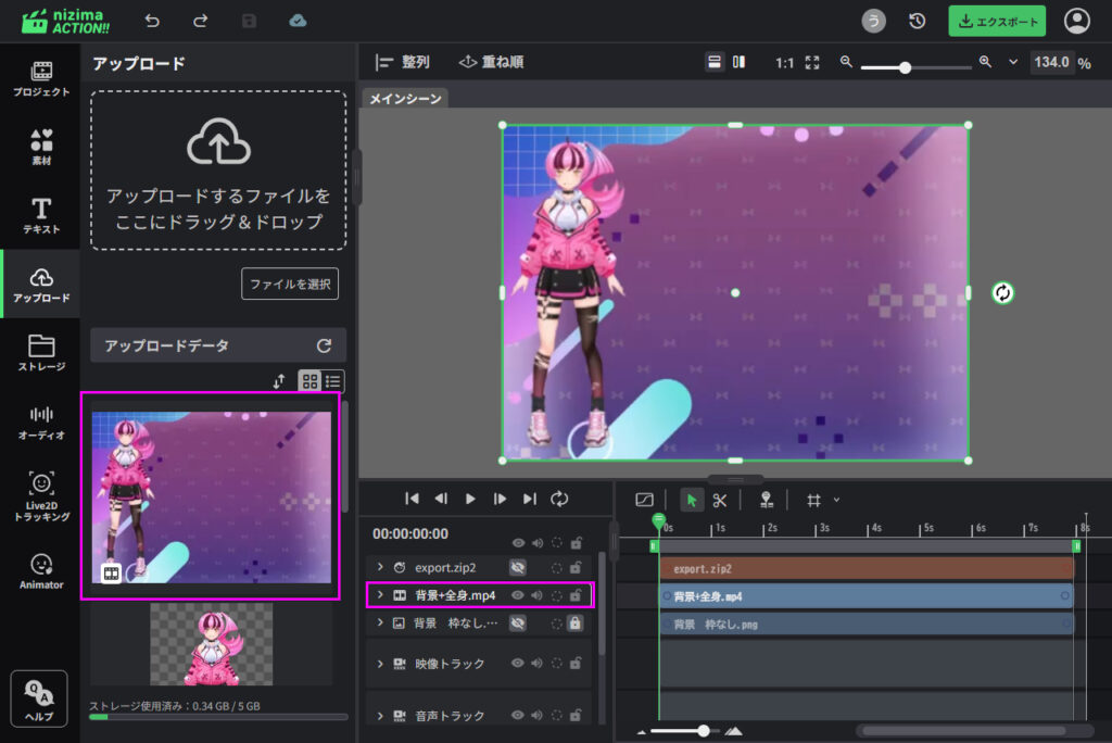 2:「背景+全身.mp4」を素材としてインポートし背景にする