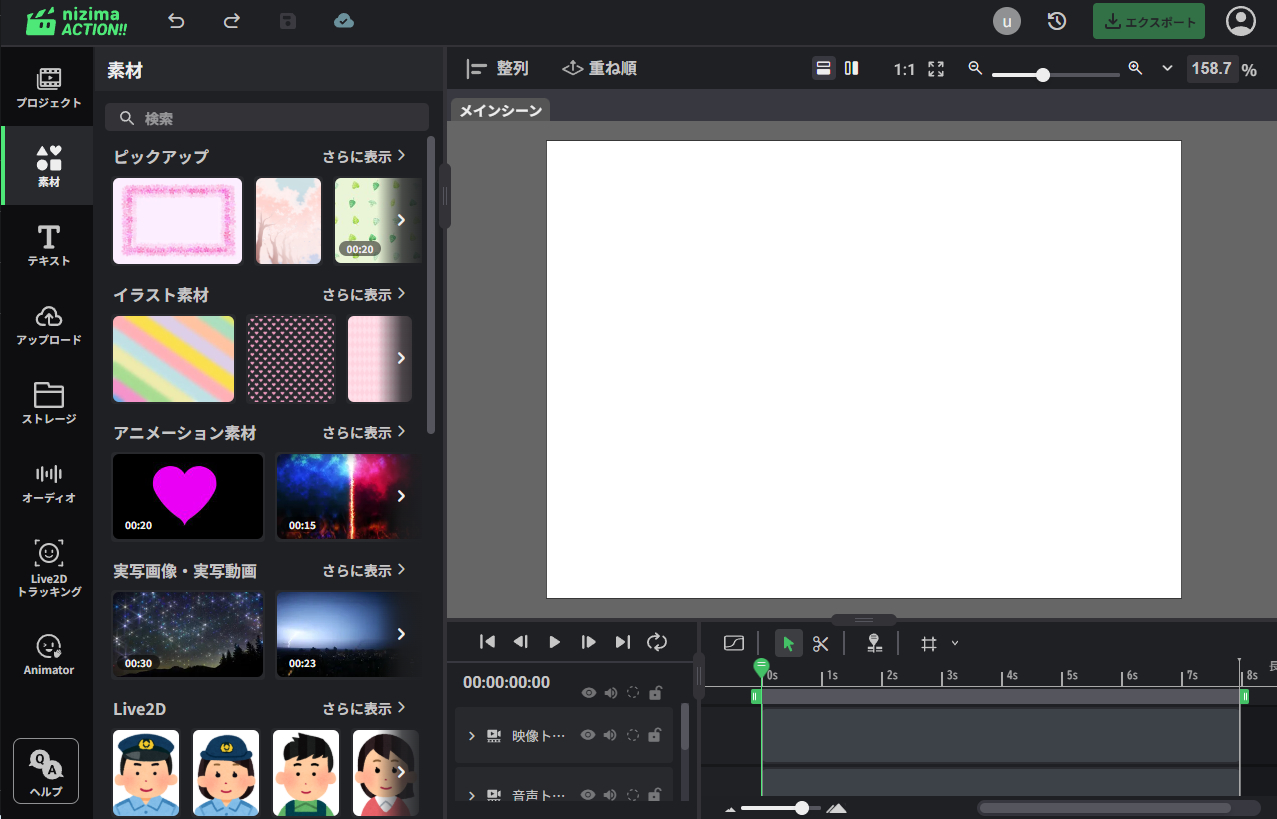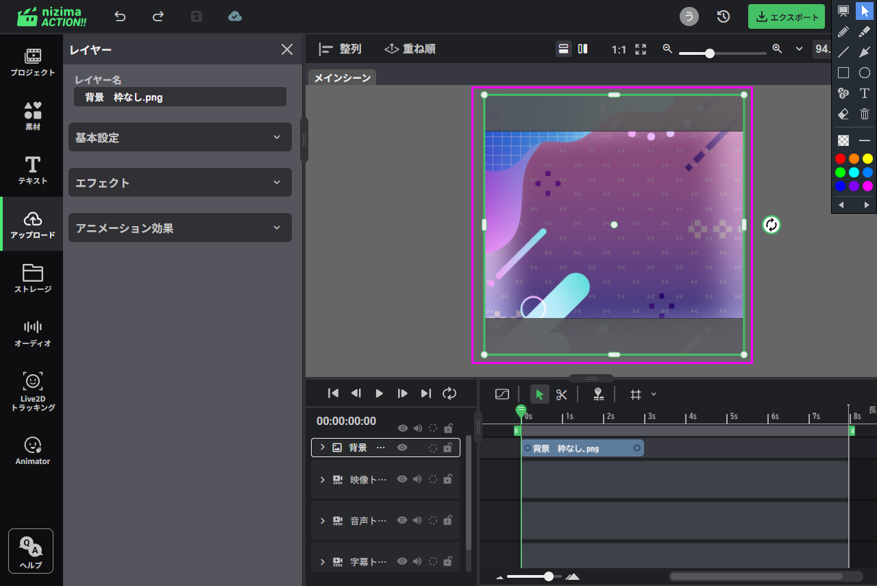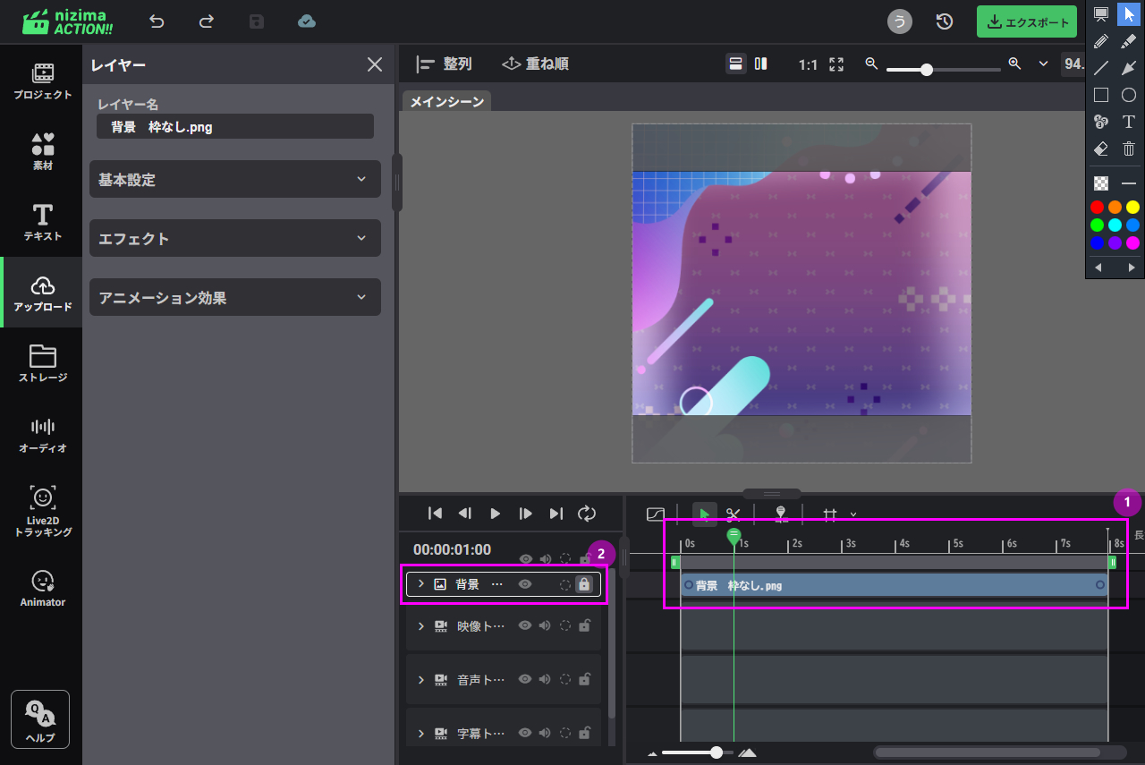 画面下部:右側の「トラック・レイヤー」にて「素材の秒数を最長(8秒)」にする