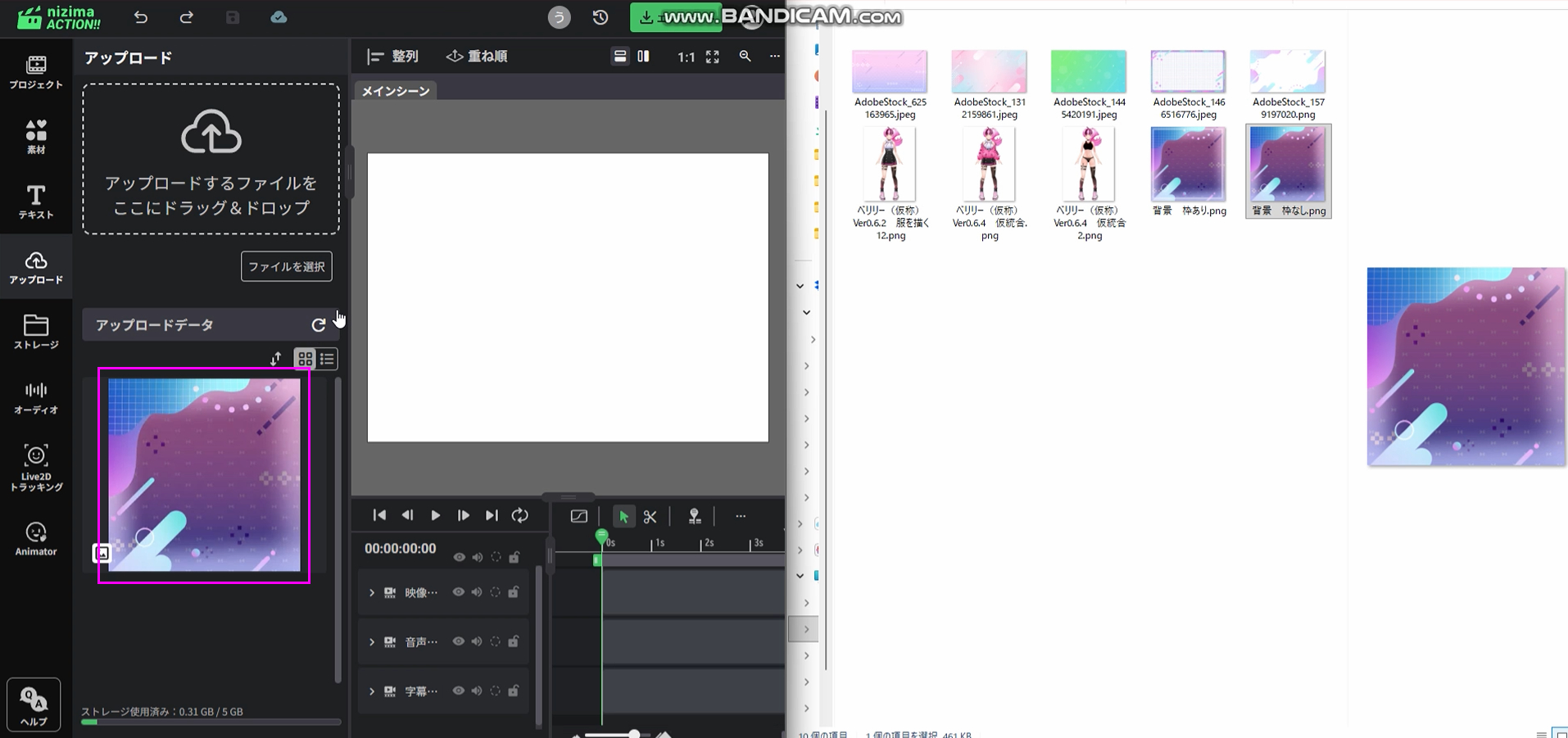 事前に作成/準備した「背景画像」をドラッグしてサイトに移動させると「アップロード画面」に移るので