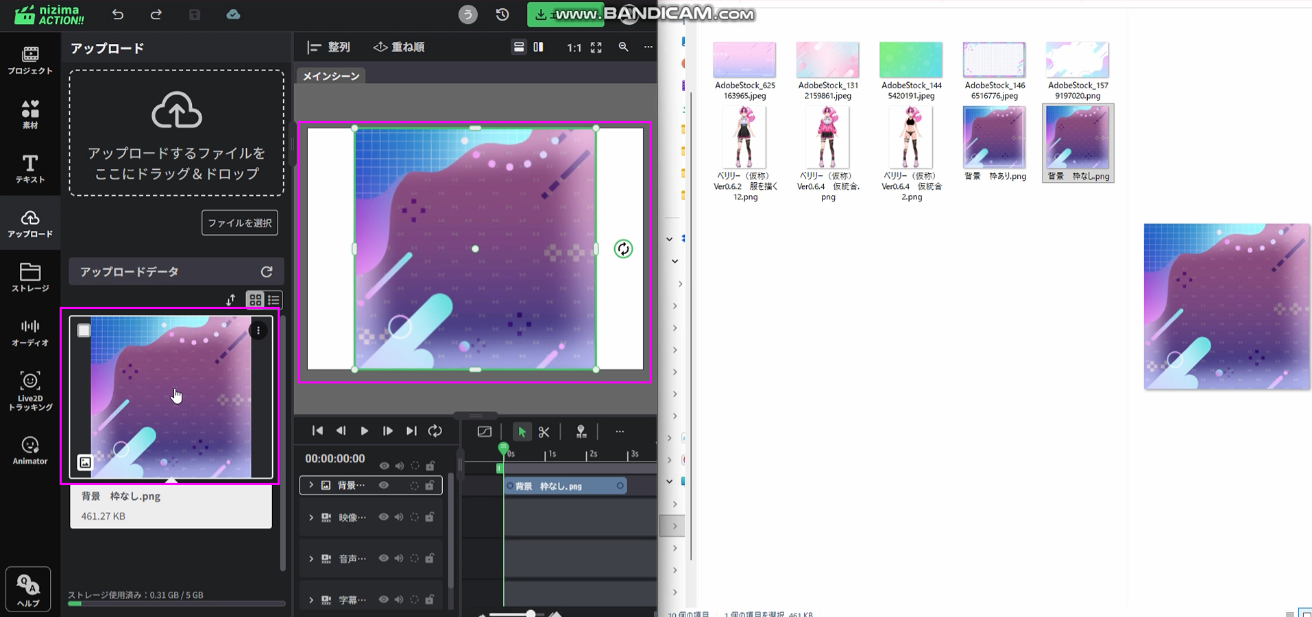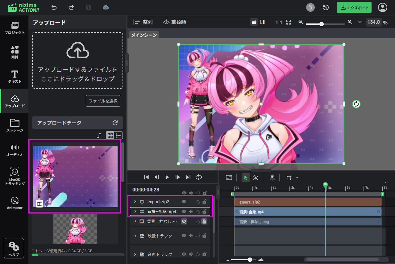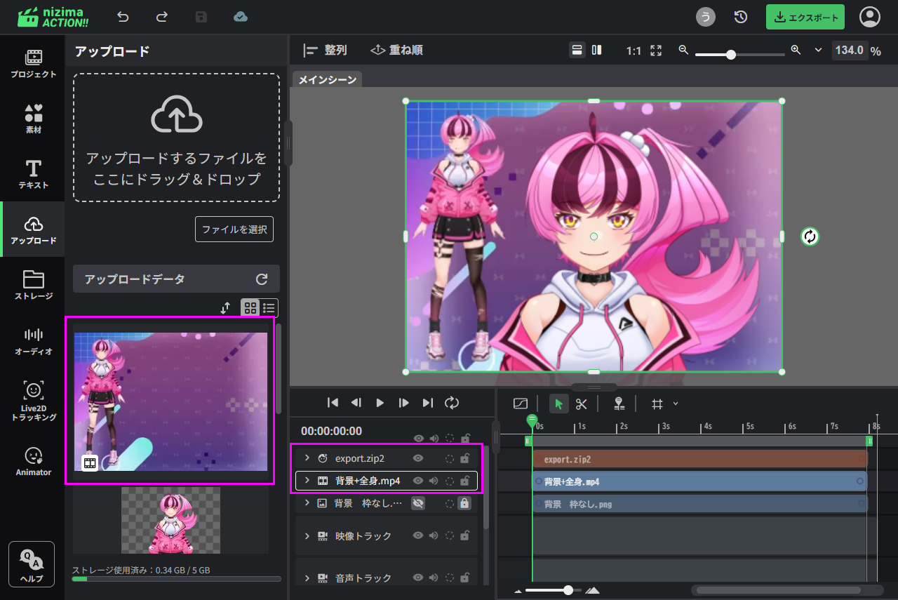 2:「背景+全身.mp4」を素材としてインポートし背景にする