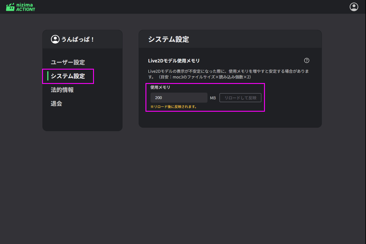 「ユーザー設定」⇒「システム設定」⇒「Live2Dモデルの使用メモリ」を