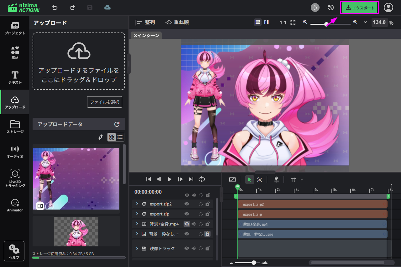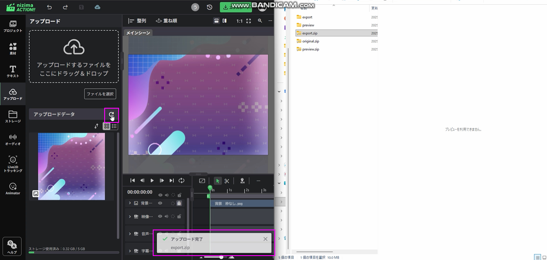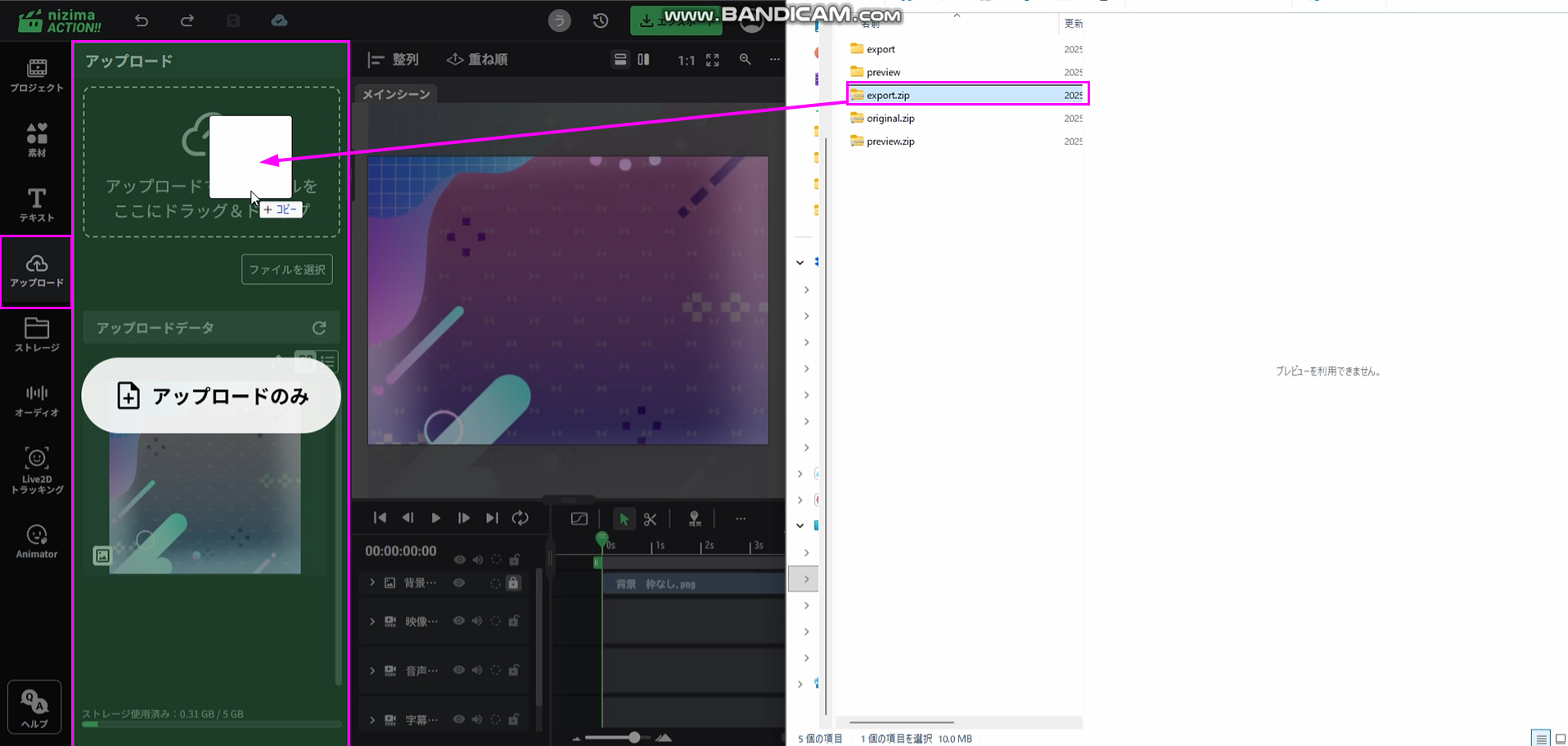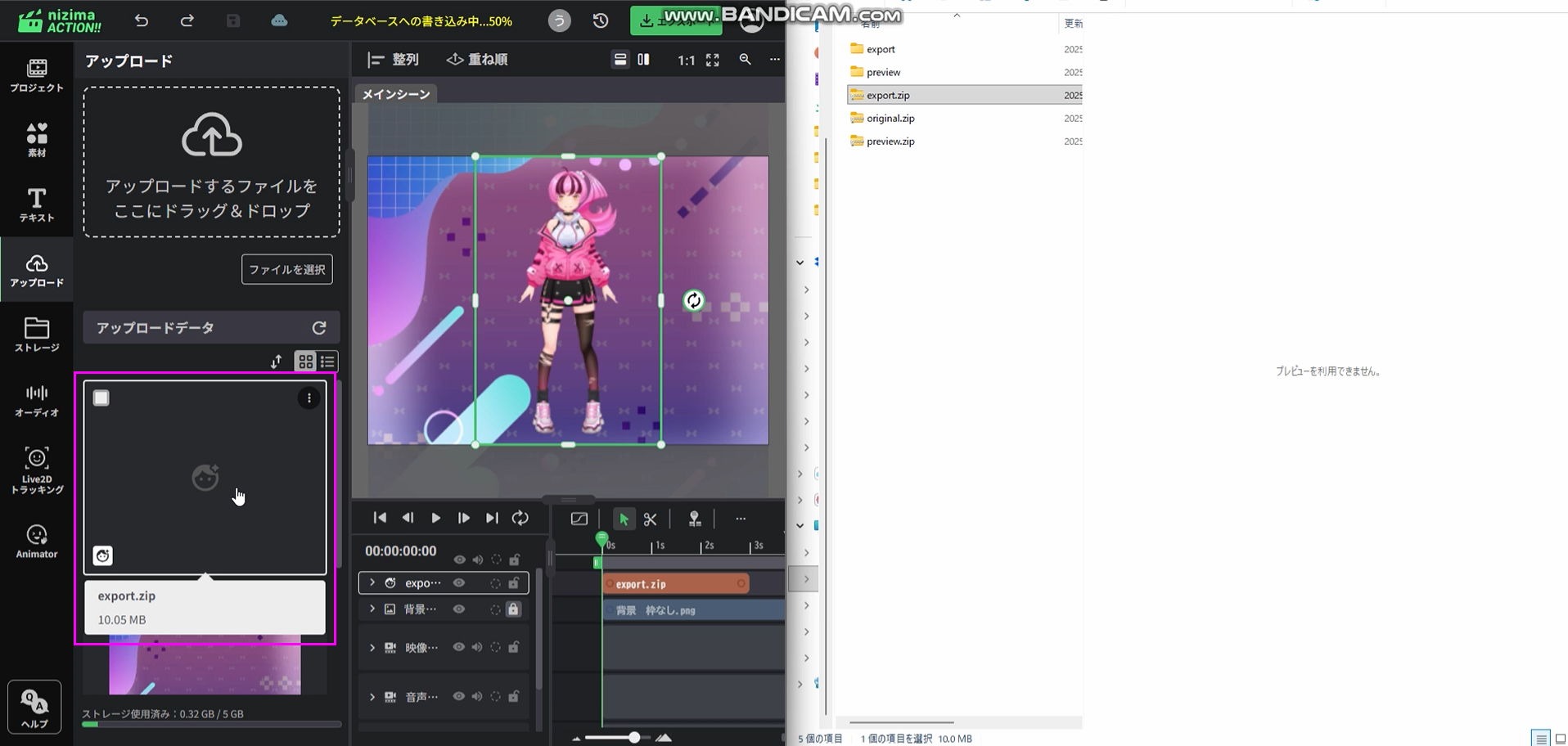 この「export.zip」データを「Nizima Action!!」にアプロードしよう