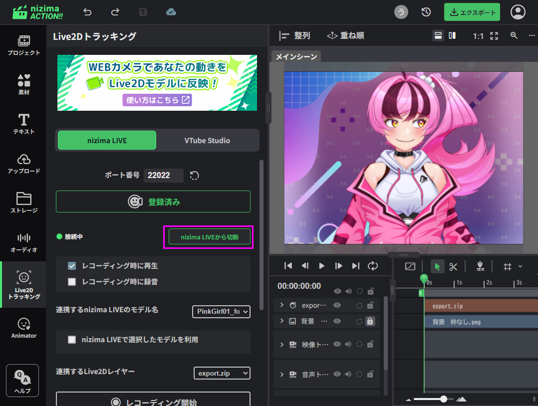 「nizima LIVE に接続」を無効化してないと「キャラ」が撮影内容と関係なく動き出す